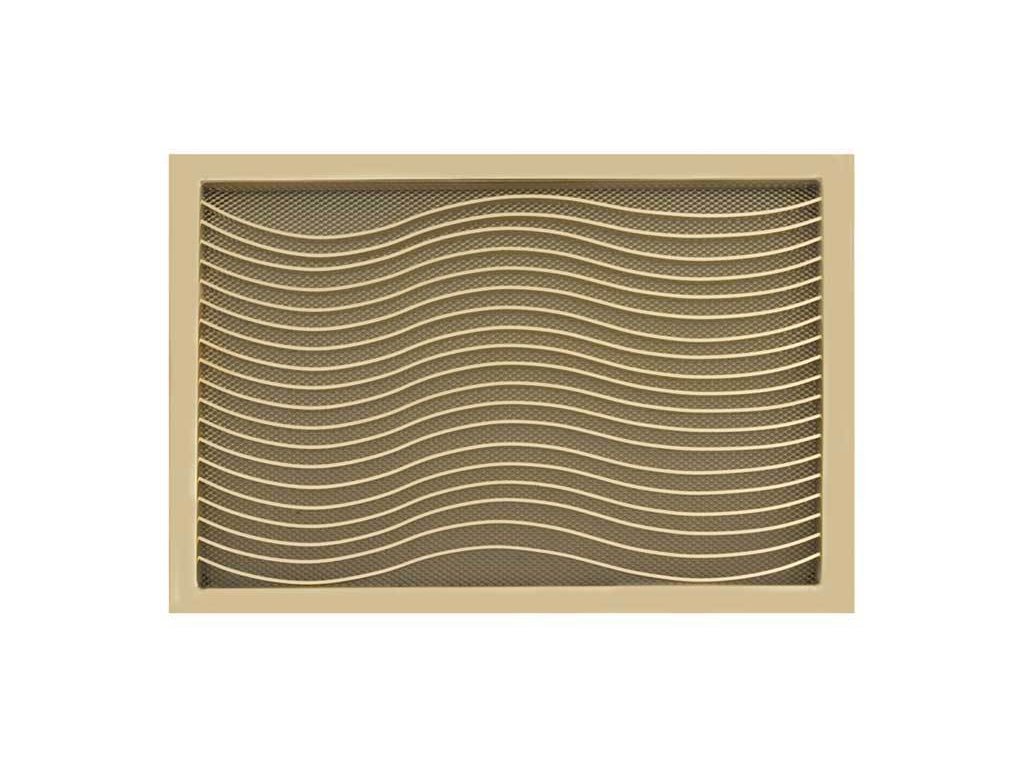 Ocelová krbová mřížka s neregulovací žaluzií (vlnovka). Luxusní ocelová krbová mřížka s neregulovací žaluzií. Vhodná pro osazení do teplovzdušných kachlových kamen a krbových obestaveb, ale i do jakýchkoliv teplovzdušných rozvodů (vzduchotechniky) nebo větracích rozvodů. Krbová mřížka odolává vyšším teplotám. Povrchová úprava mřížek je pozlacená (24-karat. zlato). Mřížku lze komplet vysunout a použít jako revizní otvor. Uvnitř mřížky je vyndávací kovová síťka - tahokov, která zabraňuje pohledu dovnitř.