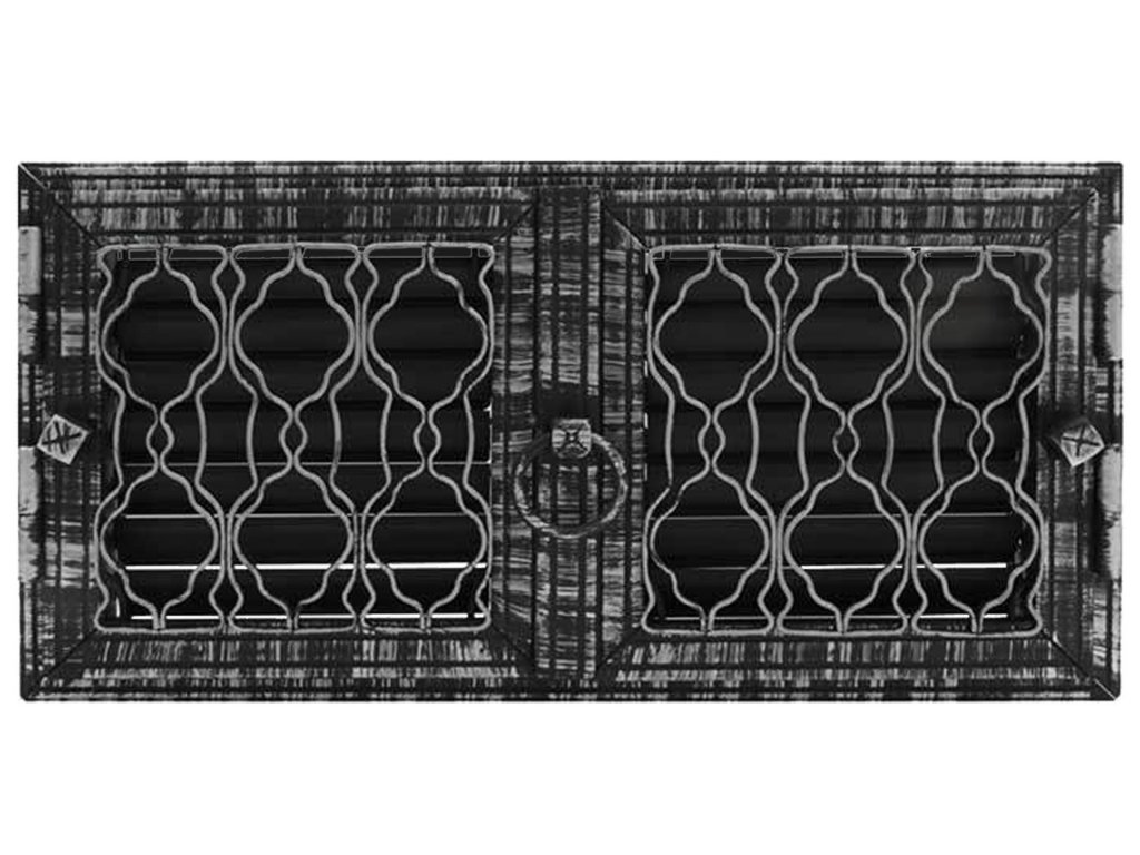 Ocelová krbová mřížka s regulovací žaluzií a otevíracími dvířky. Ocelová krbová mřížka s regulovací žaluzií a otevíracími dvířky. Vhodná pro osazení do teplovzdušných kachlových kamen a krbových obestaveb. Povrchová úprava mřížek je stříbrno-černá "antik". Mřížku lze komplet otevřít a použít jako revizní otvor.